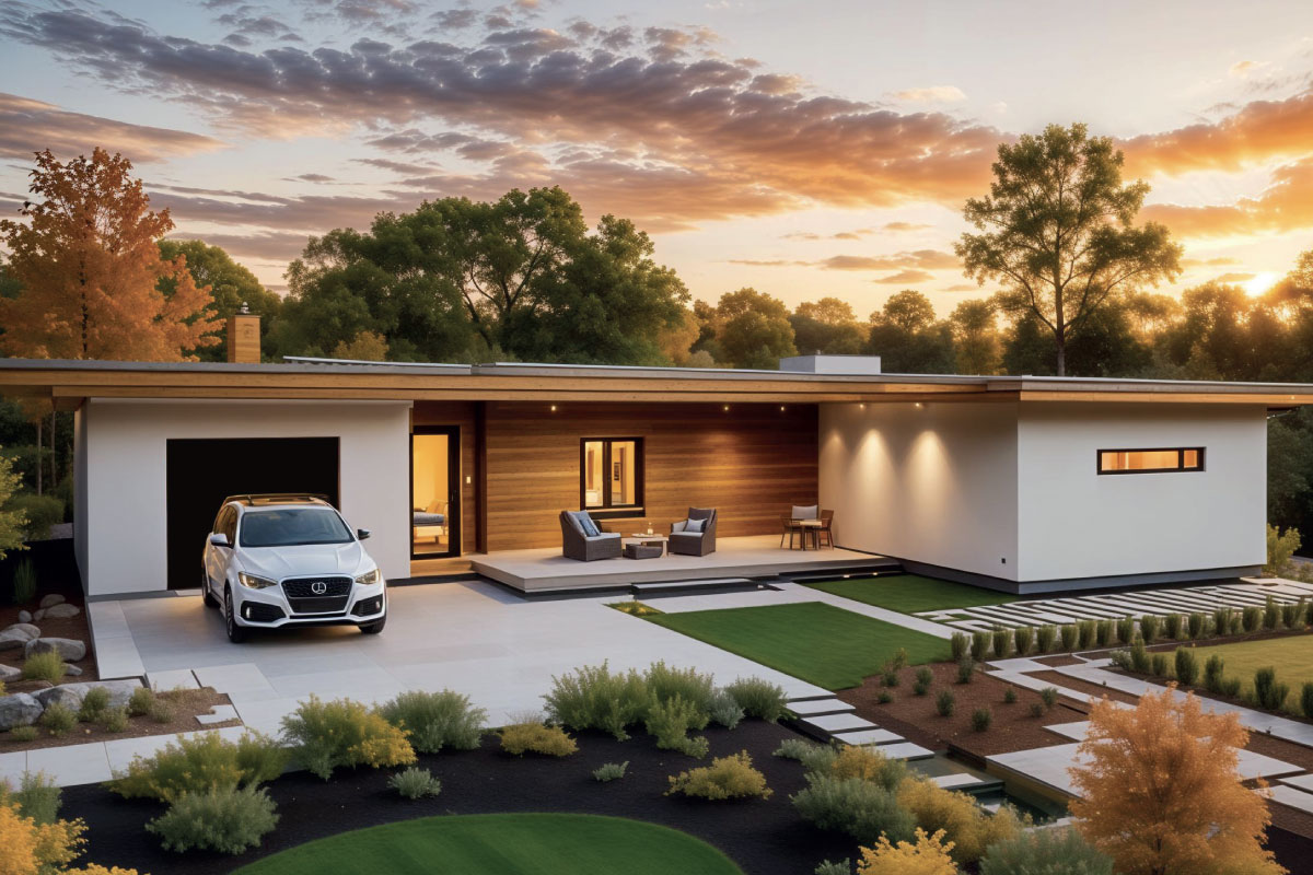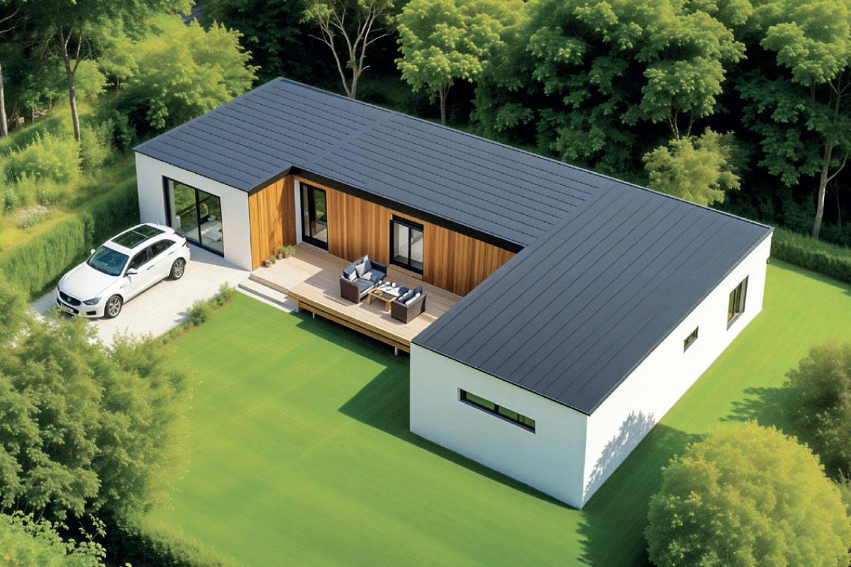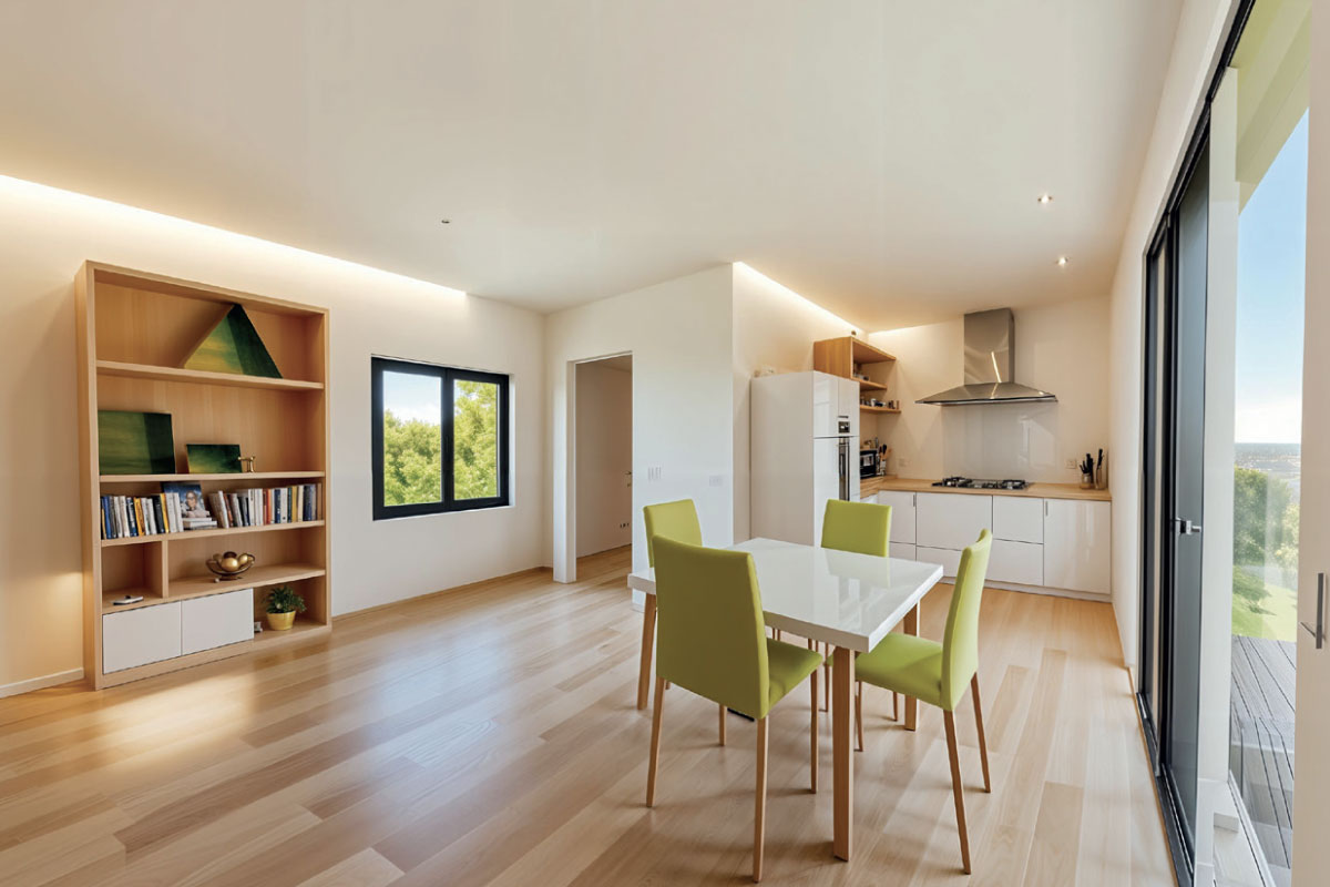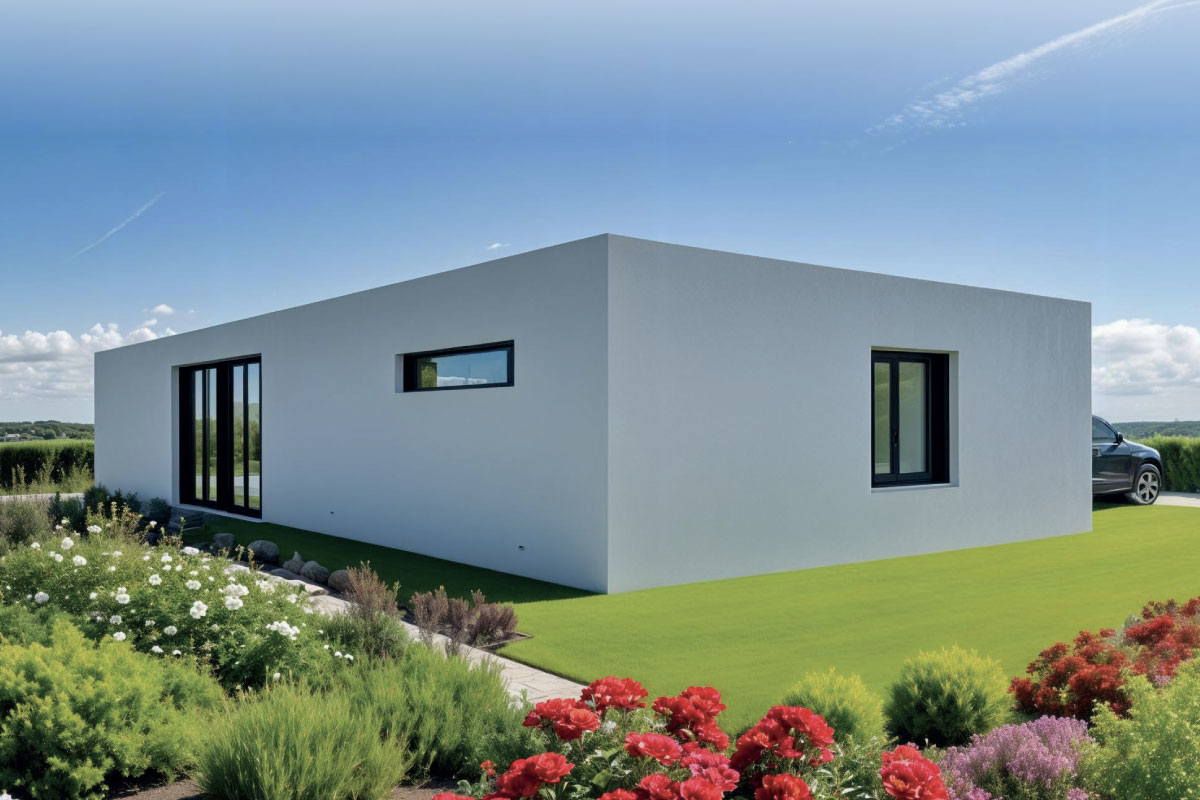 PVC střecha, výplně otvorů plast, podlaha, vinyl, stěny a strop SDK, interíérové dveře obložkové, koupelna dlažba, obklad, Geberit WC, keramické umyvadlo, sprchový kout, fasáda dřevo/omítka, výmalba, interiér a exteriér osvětlení, zásuvky, rozvaděč