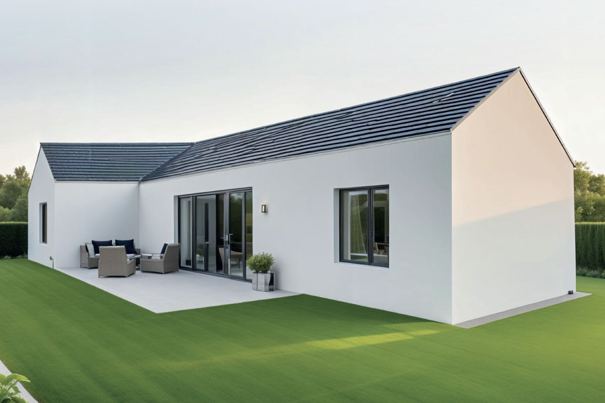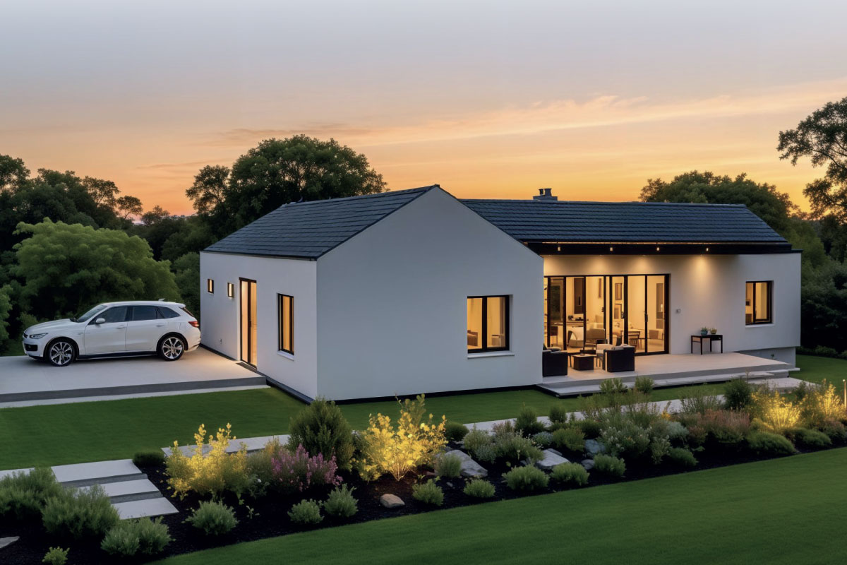 PVC střecha, výplně otvorů plast, podlaha, vinyl, stěny a strop SDK, interíérové dveře obložkové, koupelna dlažba, obklad, Geberit WC, keramické umyvadlo, sprchový kout, fasáda dřevo/omítka, výmalba, interiér a exteriér osvětlení, zásuvky, rozvaděč