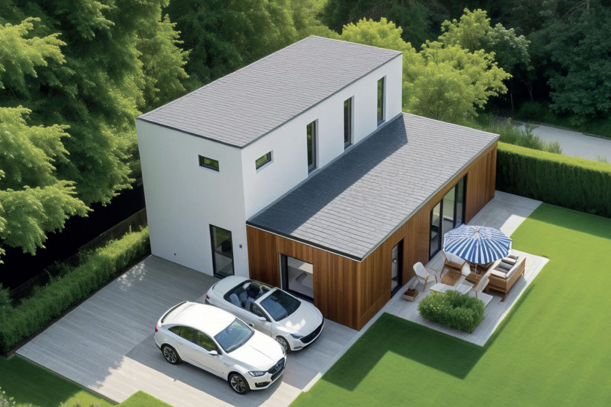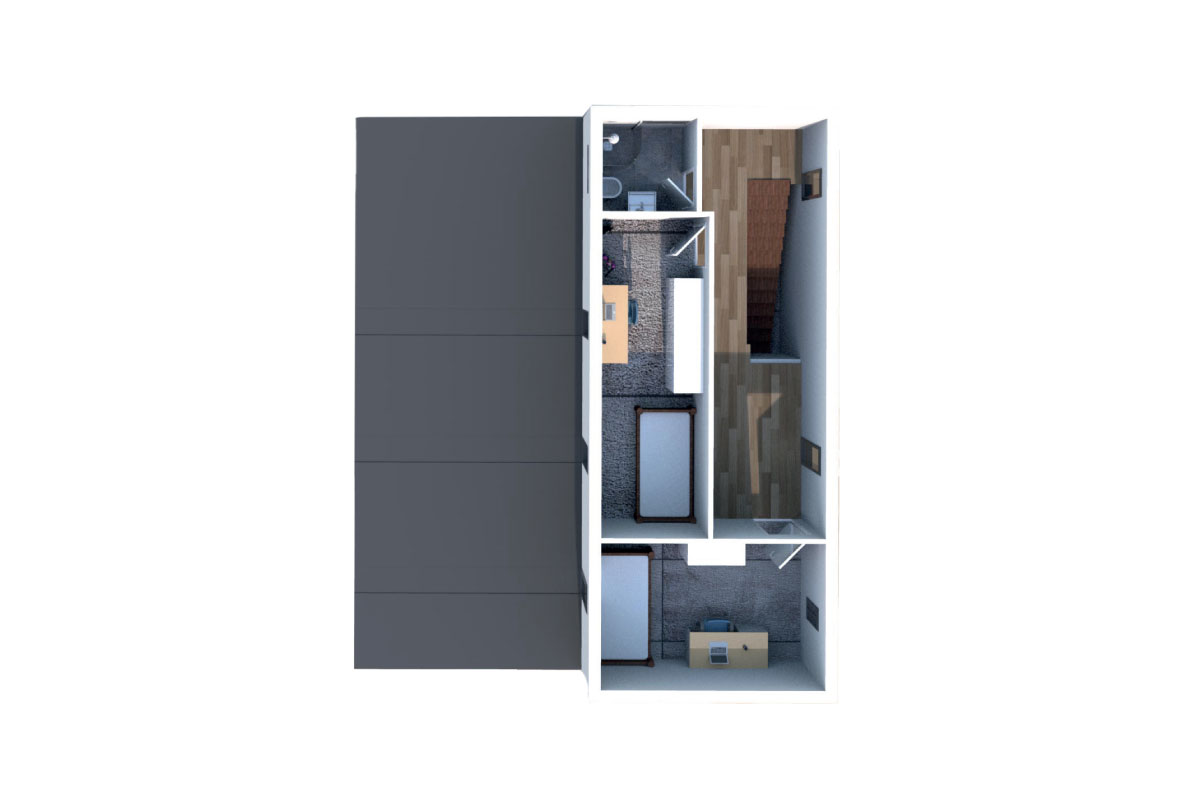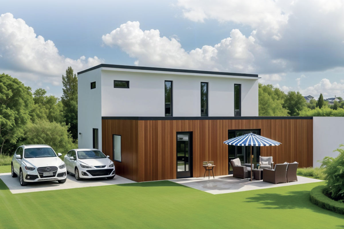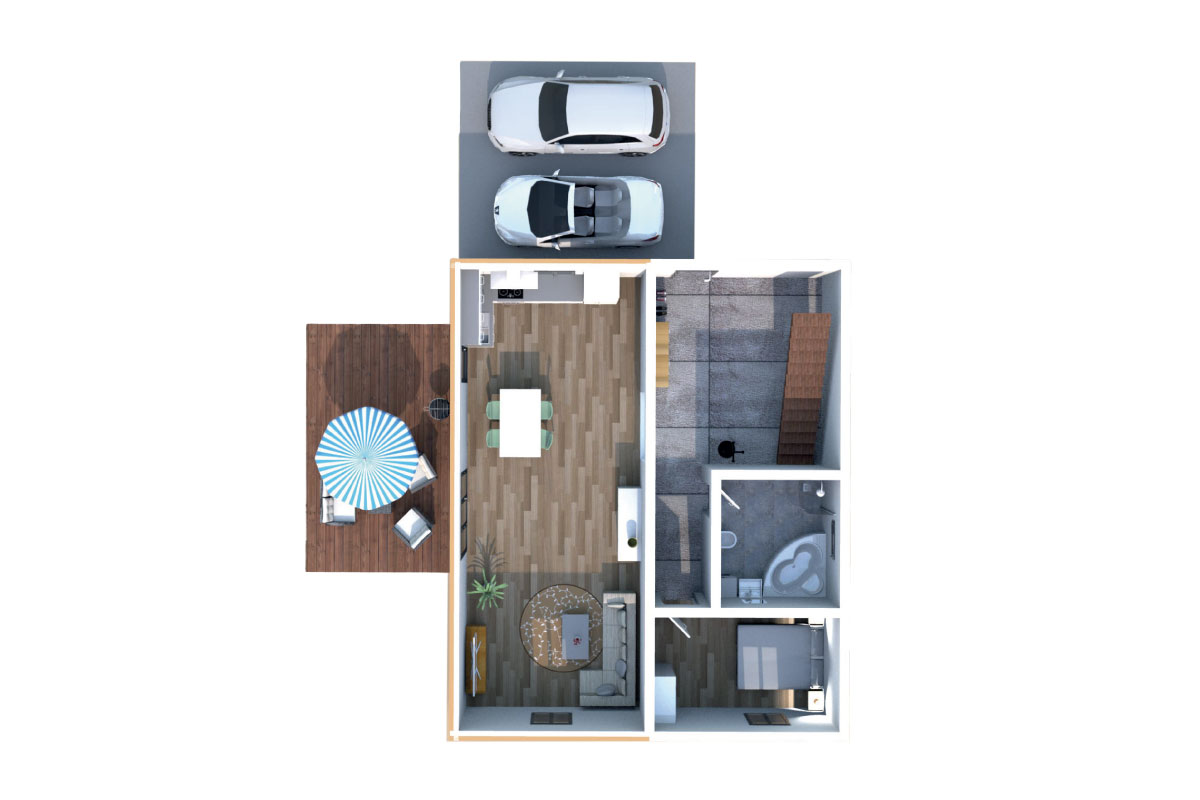 PVC střecha, výplně otvorů plast, podlaha, vinyl, stěny a strop SDK, interíérové dveře obložkové, koupelna dlažba, obklad, Geberit WC, keramické umyvadlo, sprchový kout, fasáda dřevo/omítka, výmalba, interiér a exteriér osvětlení, zásuvky, rozvaděč